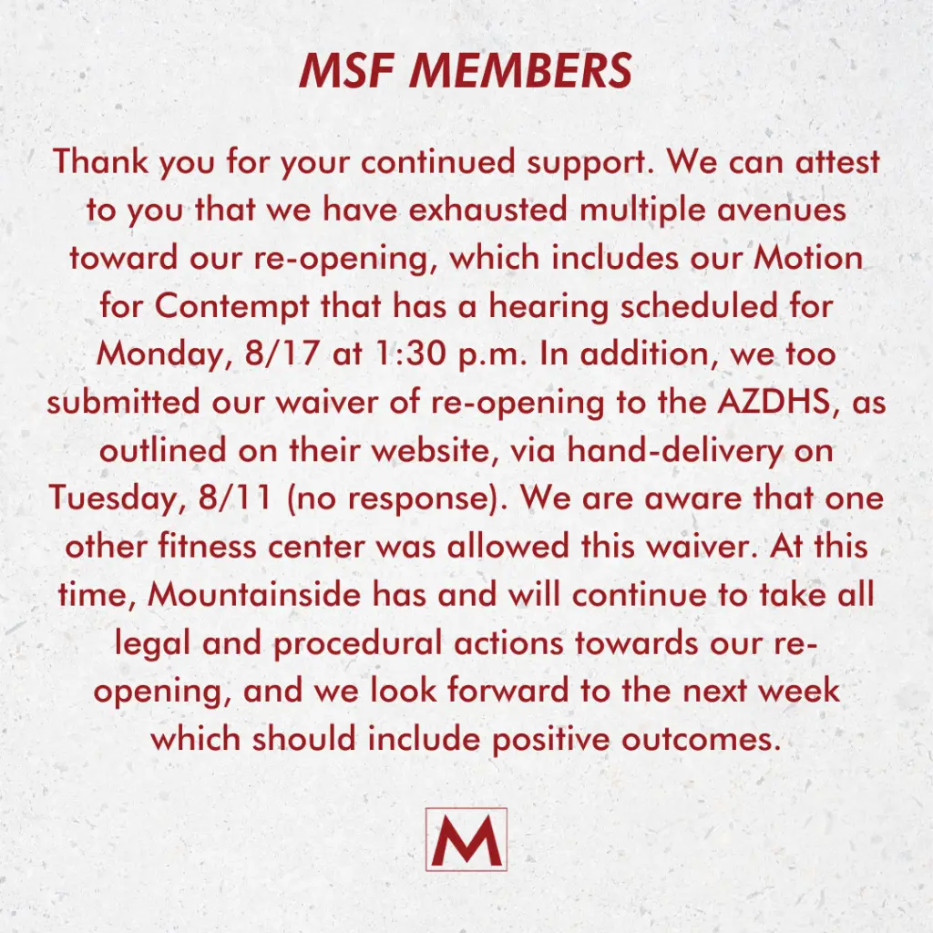 Thank you for your continued support. We can attest to you that we have exhausted multiple avenues toward our re-opening, which includes our Motion for Contempt that has a hearing scheduled for Monday, 8/17 at 1:30 p.m. In addition, we too submitted our waiver of re-opening to the AZDHS, as outlined on their website, via hand-delivery on Tuesday, 8/11 (no response). We are aware that one other fitness center was allowed this waiver. At this time, Mountainside has and will continue to take all legal and procedural actions towards our re-opening, and we look forward to the next week which should include positive outcomes.