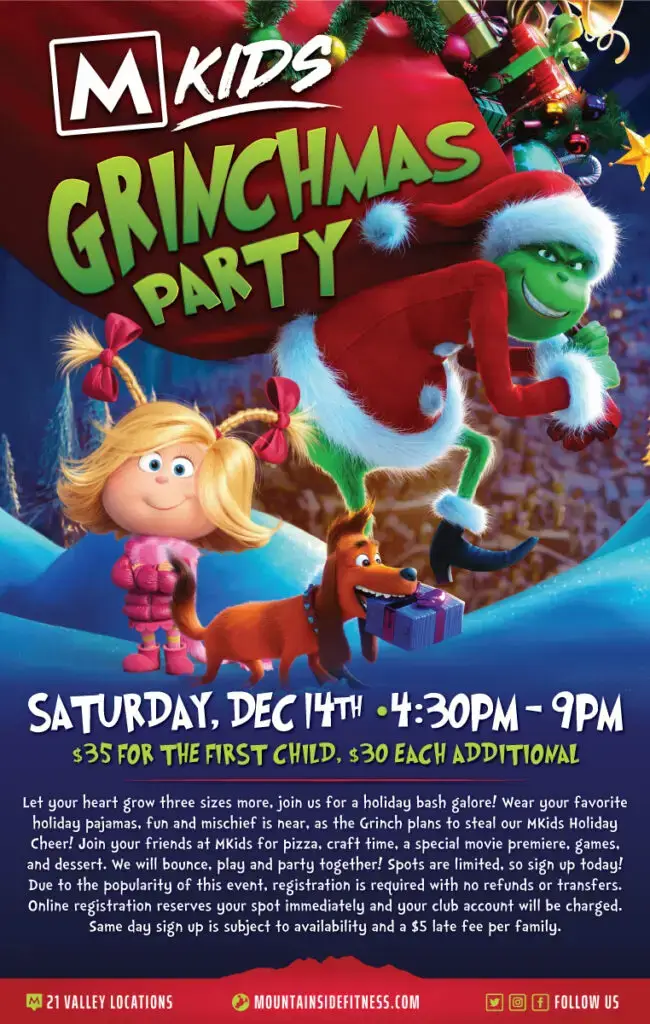 MKids Grinchmas PartySaturday, December 14th, 20244:30pm – 9:00pm Register Below MKids Grinchmas Party First Name*Last Name*Barcode*Email* Phone*ClubAvondale (20 Spots Remaining)Cadence (East Mesa) (35 Spots Remaining)Desert Ridge (33 Spots Remaining)Frank Lloyd Wright (10 Spots Remaining)Gilbert (23 Spots Remaining)Happy Valley (18 Spots Remaining)Mesa (40 Spots Remaining)Paradise Valley (11 Spots Remaining)Queen Creek (65 Spots Remaining)Scottsdale Pavilions (Indian Bend) (5 Spots Remaining)Scottsdale Shea (Sahuaro Dr) (15 Spots Remaining)Surprise (23 Spots Remaining)Number of children attending12345678910+