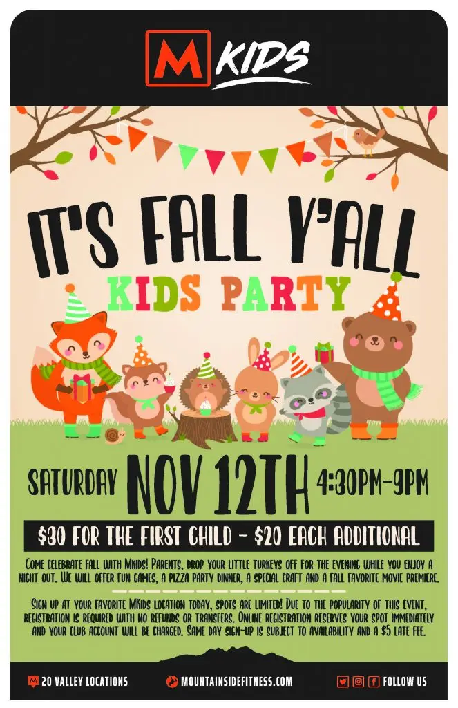 MKids IT’S FALL Y’ALLSaturday, November 12th, 20224:30pm – 9:00pm Register Below MKids IT'S FALL Y'ALL First Name*Last Name*Barcode*Email* Phone*ClubArrowheadHappy ValleyParadise ValleyScottsdale SheaCadenceCarefreeQueen CreekSurpriseDesert RidgeGilbertChandler/OcotilloNumber of children attending12345678910+